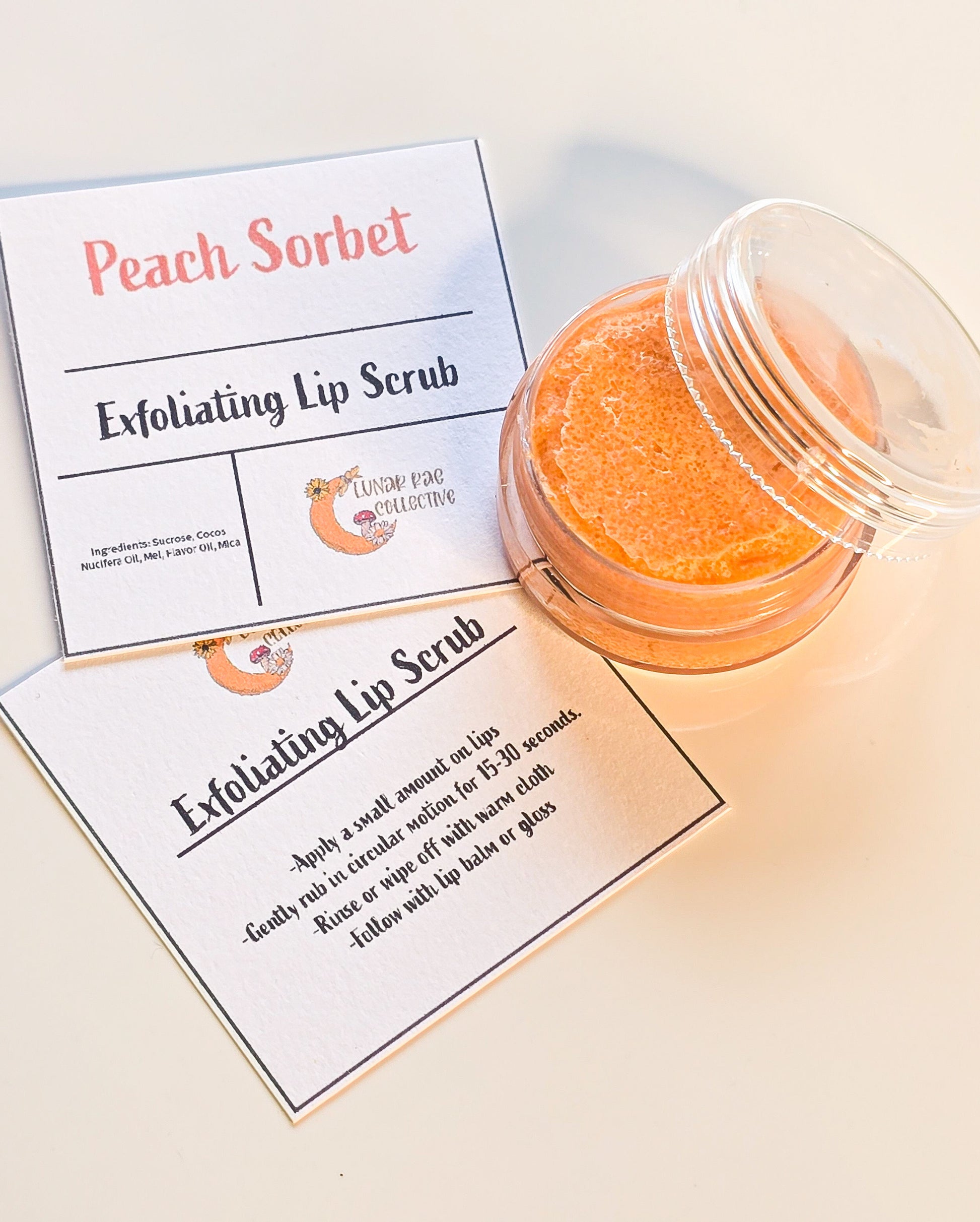 Our Peach Sorbet lip scrub is handmade, moisturizing, and all-natural, making it an ideal flavored lip scrub, exfoliating lip treatment, or sweet gift for yourself or loved ones.