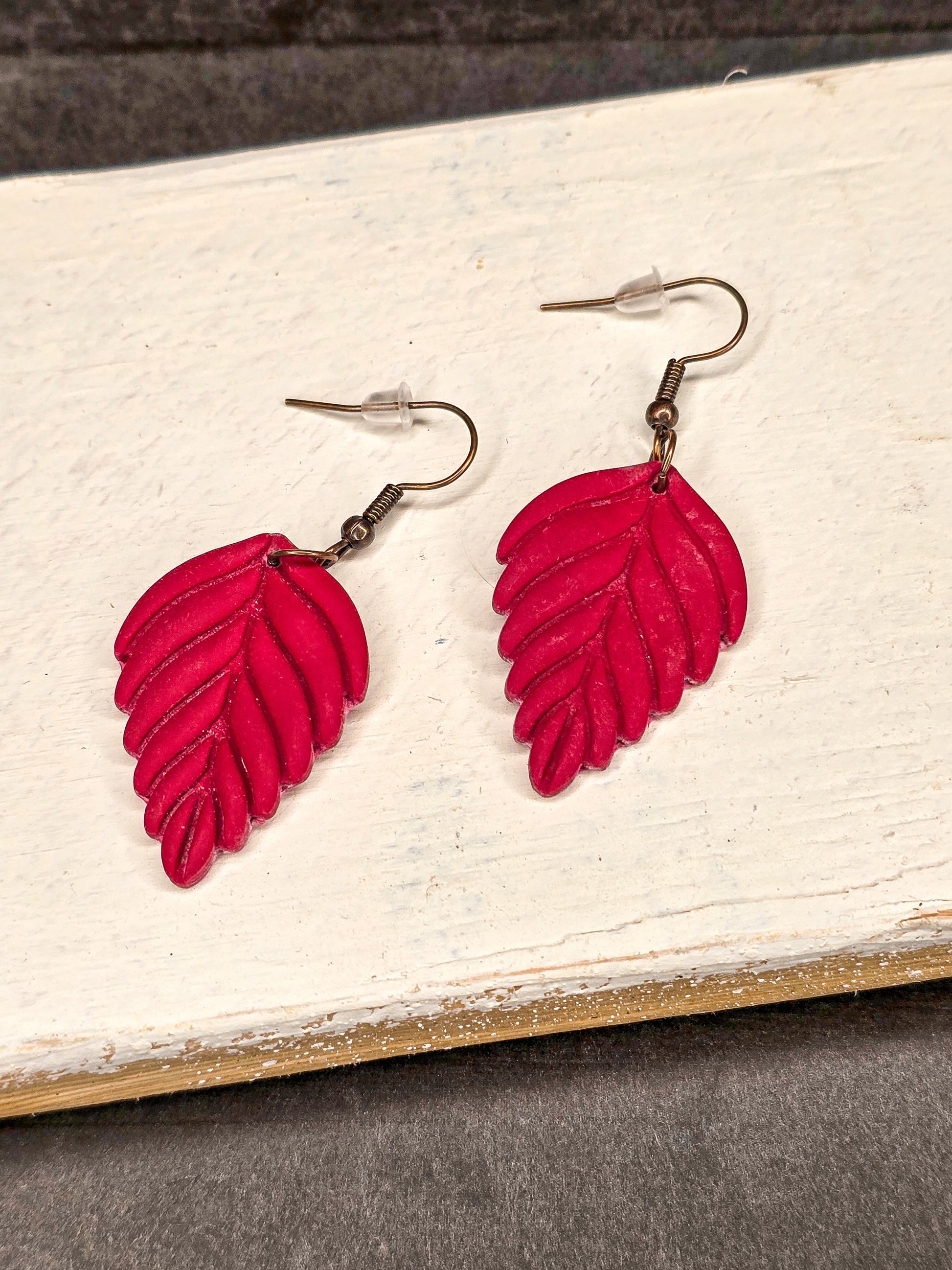 Elevate your style with these handmade polymer clay earrings featuring simple red fancy leaf dangles. Each pair is carefully crafted by hand, making them truly one-of-a-kind.